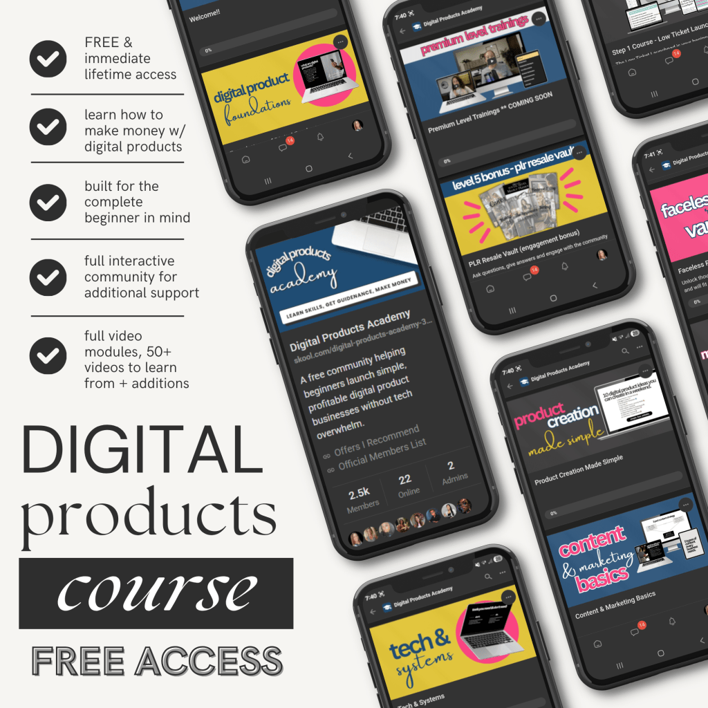 The Digital Products Academy (DPA) is a 100% free Skool community created to help you learn how to make money online with digital products in a way that actually makes sense.
